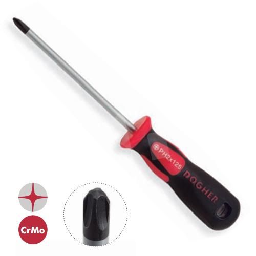 Destornillador con boca Phillips PH2 de 125 mm de longitud. Con mango de dos materiales que fortalece la sujeción. Fabricado con CrMo. De gran resistencia y duración.