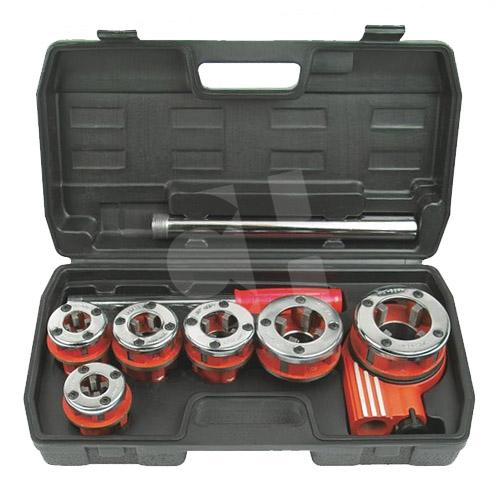 Juego de Terrajas de 9 piezas. Marca Mannessman. Con maletín resistente para llevar y guardar las terrajas. El juego se compone de seis terrajas de carraca conica para tubos según rosca DIN. Las medidas de las terrajas de carracas son de 1/4", 3/8", 1/2", 1 y de 1 1/4". Palanca de prolongación de dos piezas y mango. Cada una de las carracas son de gran calidad y resistencia.